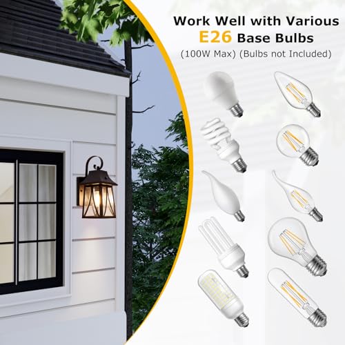 【Easy Installation and Replaceable Bulbs】the large exterior wall light fixtures is easy to set up under the guidelance of installation instruction;it are compatible with all E26 base bulbs up to 100W. You can choose different bulbs according to your preference to create different lighting atmosphere for your family. (Note: bulbs are not included in the package)