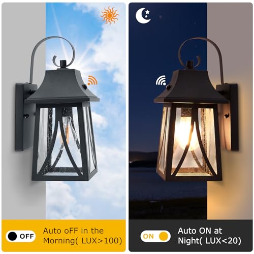 【Dusk to Dawn Outdoor Wall Lanterns】with upgraded photoelectric sensor, the outdoor wall light can sensitively detect the brightness of the surrounding environment and adjust the switch. Auto turns on when brightness is lower than 20 LUX at night, auto turns off when brightness exceeds 100 LUX in the daytime, convenient, environment friendly, energy-saving wall lighting.
